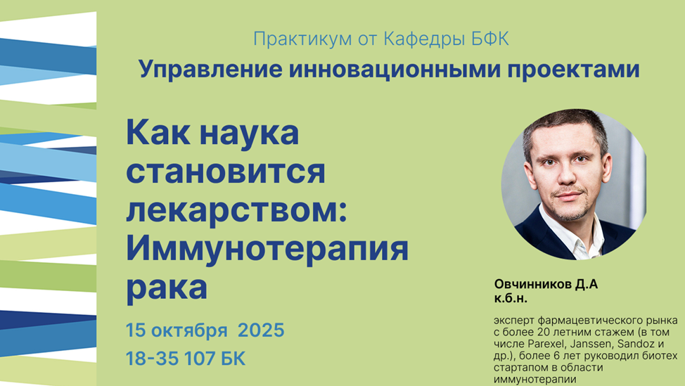 Спикер: Дмитрий Овчинников, выпускник МГУ им. Ломоносова, Биологический факультет, кандидат биологических наук, эксперт фармацевтического рынка с более 20 летним стажем (в том числе Parexel, Janssen, Sandoz и др., более 6 лет руководил биотех стартапом в области иммунотерапии)